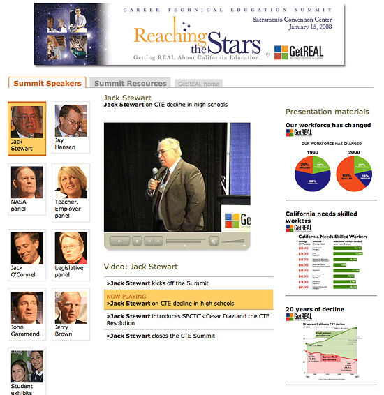The GetREAL coalition – a Caifornia group that works to increase career technical education in public schools – uses this website to showcase video of speakers at their event.